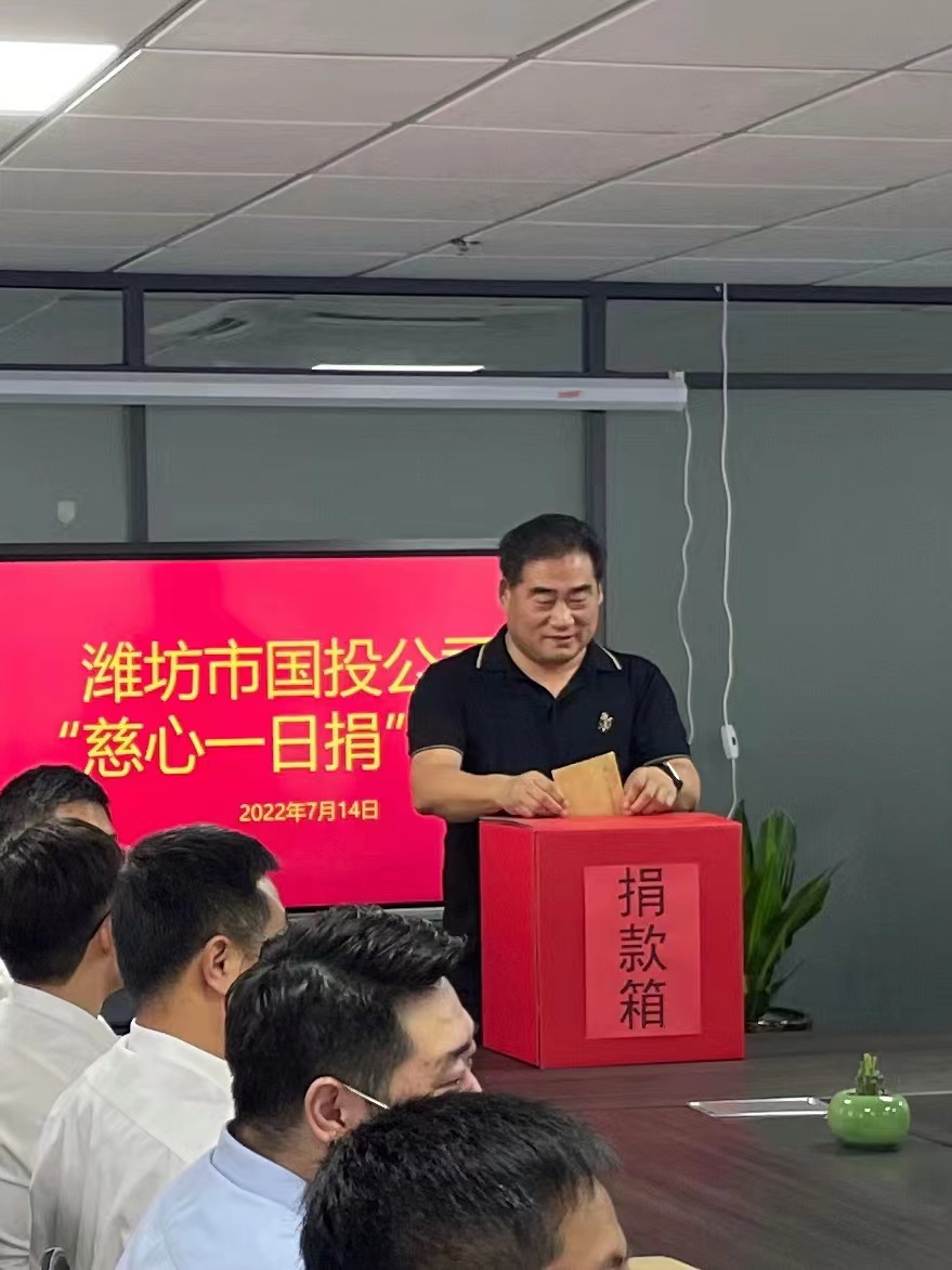 為進一步弘揚崇慈向善、扶貧濟困的傳統美德,7月14日下午,市國投公司開展“慈善一日捐”活動。 活動現場,公司班子率先垂范,帶頭參與,全體職工積極響應,踴躍捐款,依次將凝聚著愛心的善款投入箱內,共同為慈...